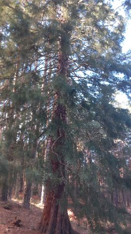 Además, junto al camino sorprende la presencia de una secuoya, un ejemplar singular y poco habitual en esta zona de la sierra, que destaca claramente entre los pinos por su porte y su tronco masivo: