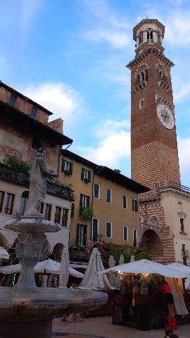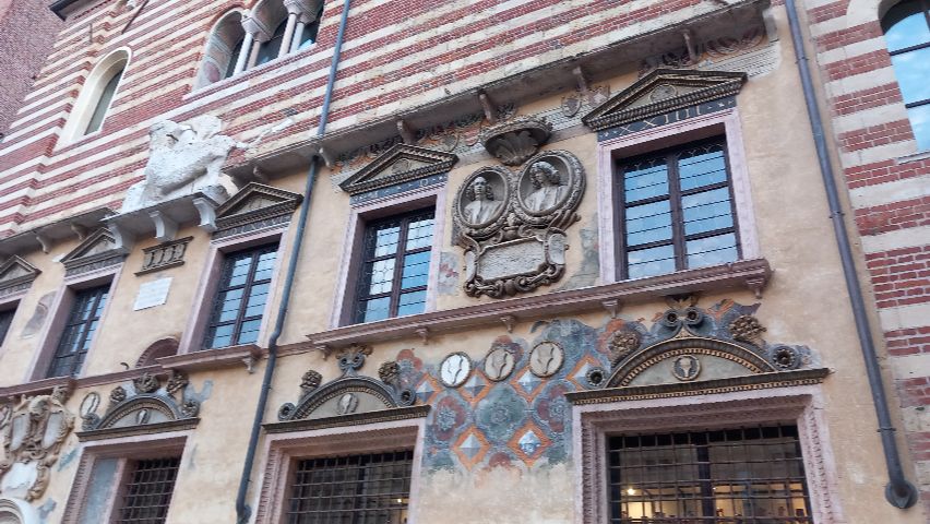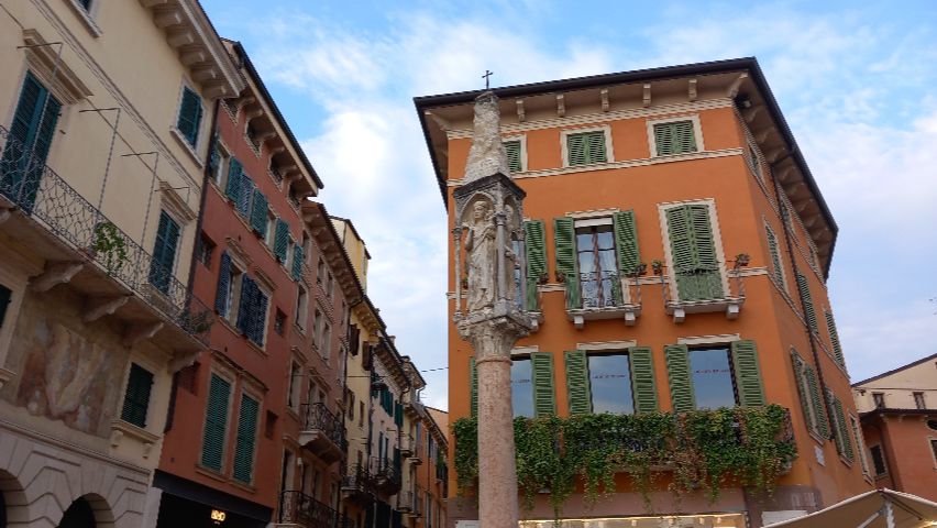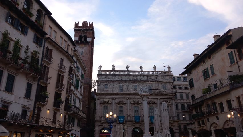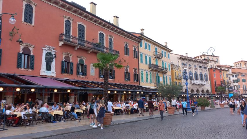 Cada edificio mezcla estilos desde el románico al renacentista, reflejando el paso de distintas familias gobernantes y del dominio veneciano. En el centro se levanta la estatua de Dante Alighieri, quien vivió en Verona durante su exilio.