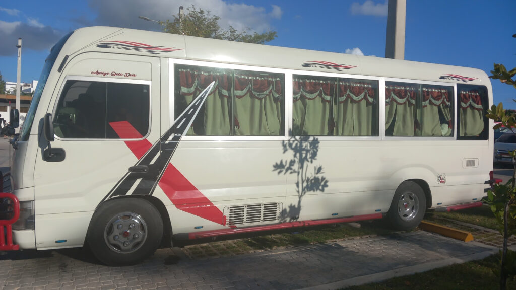 Nos recogieron a las 08:35, perfectamente puntuales en el hotel Sunscape Dominicus la Romana. El taxi que nos recogio era muy nuevo, una minivan de 11 plazas, aunque solo fuimos 8 en total. Recogieron a 2 parejas en sendos hoteles de la zona de Dominicus y ya fuimos a un punto de encuentro en una gasolinera a 5 minutos de la zona de embarque del río Chavón. Allí nos encontramos con Pedrito, hicimos el pago en efectivo de la parte pendiente del tour y nos dieron unas pulseras a los adultos como acreditante del pago de la tasa del Parque Nacional de Cotubanamá. Al grupo se unió gente que venía de Punta Cana, siendo en total 30 personas en la excursión.