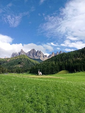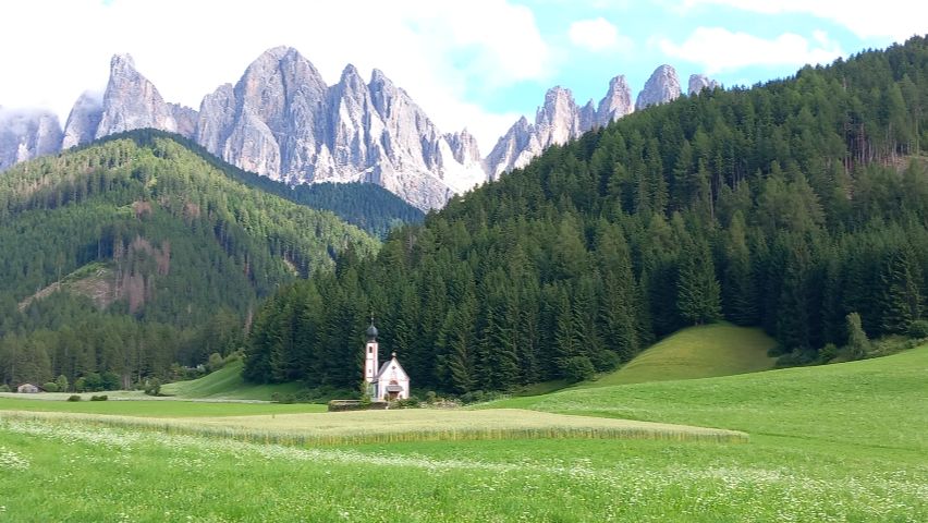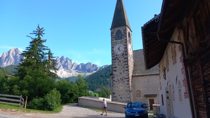 La iglesia de San Giovanni en Ranui se sitúa en un entorno idílico del Val di Funes, rodeada de praderas verdes y con las imponentes cumbres de las Odle elevándose al fondo. Su localización aislada y perfectamente integrada en el paisaje la convierte en una de las imágenes más reconocibles y fotografiadas de la zona: