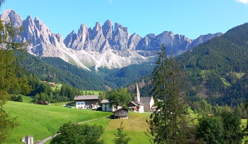 La iglesia de Santa Maddalena se encuentra en una pequeña colina en el Val di Funes y es uno de los lugares más fotografiados de los Dolomitas. Su ubicación privilegiada, rodeada de praderas abiertas y con las afiladas cumbres de las Odle como telón de fondo, crea una estampa perfectamente integrada en el paisaje alpino: