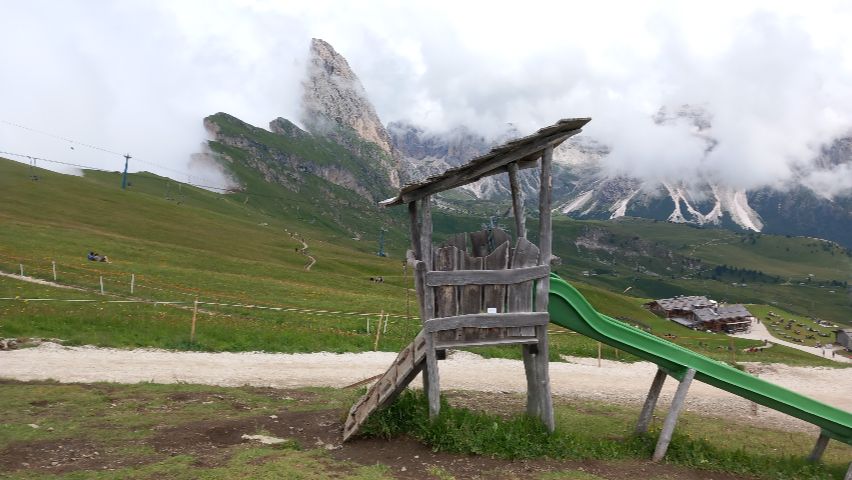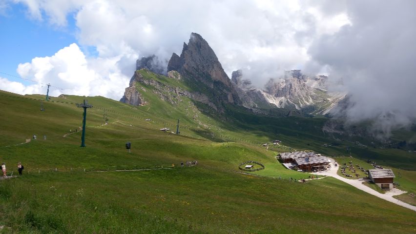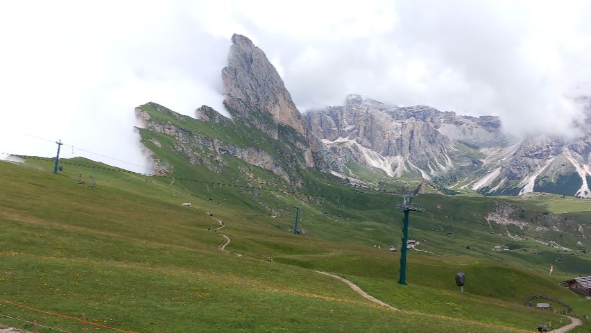 Seceda es una de las zonas más espectaculares de los Dolomitas, situada en el Val Gardena y fácilmente accesible en teleférico desde Ortisei. La subida es cómoda y rápida, lo que permite llegar a alta montaña sin esfuerzo y disfrutar desde el primer momento de un entorno alpino impresionante, con praderas verdes y formaciones rocosas únicas: